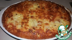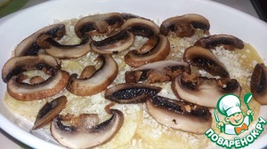 В смесь добавить муку, хорошенько перемешать и об'единить с мясной нарезкой. Выкладываем смесь в форму сверху грибочков. Сверху немного сыра и свежемолотого перца.