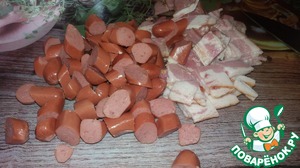 Бекон и ветчину ( сосиски или что-либо другое) нарезать небольшими кусочками.