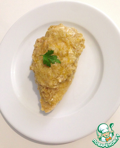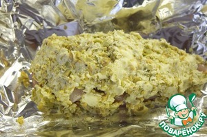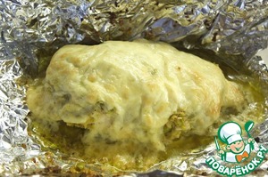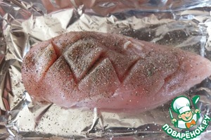 Получившуюся массу выкладываем поверх грудки. Плотно заворачиваем в фольгу, чтобы не вытекал сок.