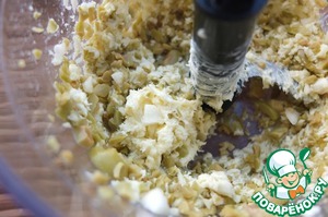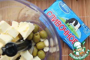 Для "соуса" в чашу блендера кладем чеснок, оливки, порезанное на кусочки сливочное масло "Экомилк".