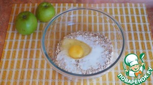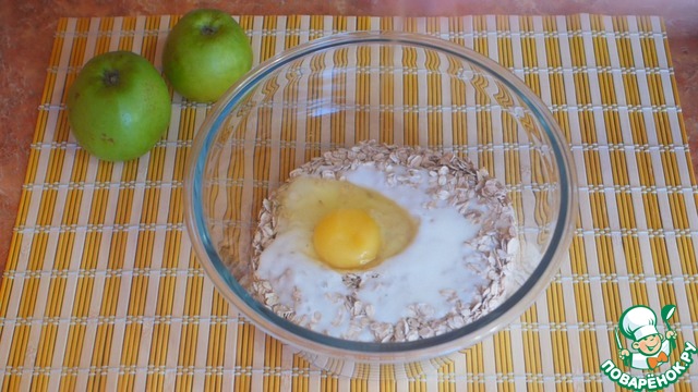 Овсяные хлопья смешать с кефиром, добавить яйцо, разрыхлитель. Дать постоять 5 минут