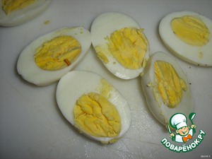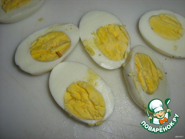 • Яйца отвариваем и разрезаем на 2 половинки (или четвертинки), кто как захочет.