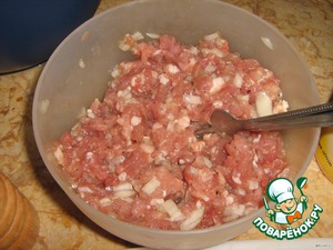 • Количество я не даю, так как сама брала его произвольно. Но фарш использован где-то 500г. Сначала делаем фарш. Просто добавляем в него мелко-порезанный лук, соль, перец по вкусу. Можно использовать абсолютно любой фарш, который есть в холодильнике.