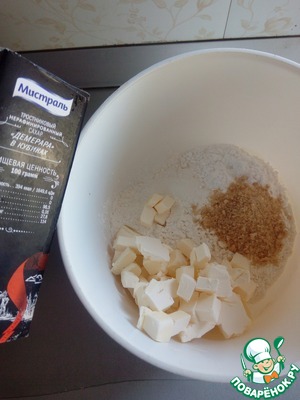 Смешиваем муку, сахарную пудру, тростниковый сахар, разрыхлитель и мелко порезанное масло. Все быстро перетираем руками в крошку.