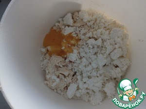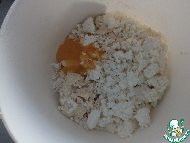 Затем вводим творог и желток. Так же быстро все смешиваем.
