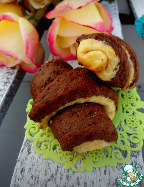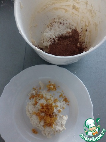 Разделяем тесто на 2 части. В одну часть теста добавляем цедру, в другую какао. Тщательно вымешиваем, но не долго.