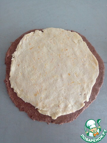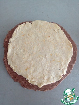 Так же раскатываем и белую часть теста и укладываем ее поверх черной. Раскатываем скалкой.