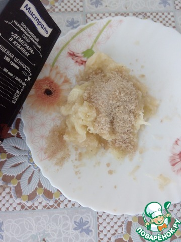 Яблоки очищаем от кожуры и трем на мелкой терке, затем слегка отжимаем сок. Смешиваем с сахаром.