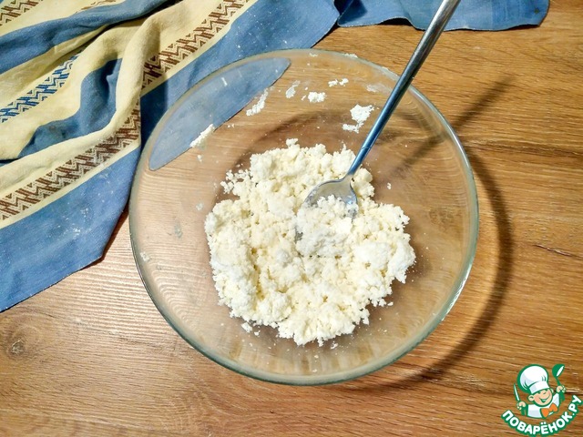 Творог хорошенько протираем через сито, чтобы избавиться от крупинок. Выкладываем перетертый творог в миску, и добавляем 75г сахара. Перемешиваем. Емкость с желатином ставим на водяную баню, до полного его растворения.