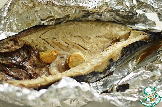 Духовку разогреть до 180С. Скумбрию вымыть, удалить внутренности, замариновать в смеси соли, перца и оливкового масла. В середину выложить чеснок, не очищая зубчики полностью от кожуры. Запечь рыбу до готовности.