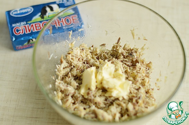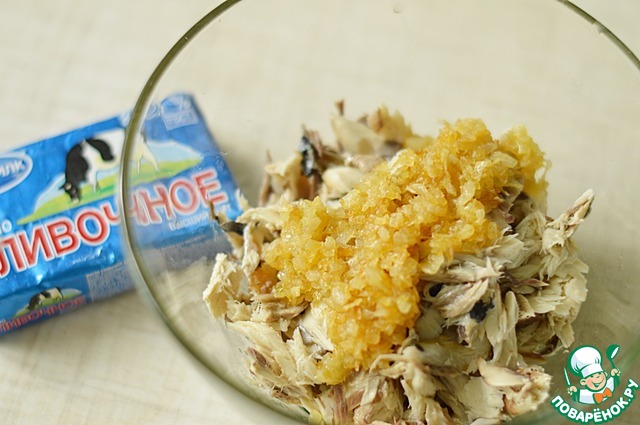 Рыбу остудить, убрать все кости. Лук мелко нарезать. 20 г сливочного масла растопить и обжарить лук. Добавить лук к рыбе. Чеснок очистить от кожуры, размять и добавить к рыбе.