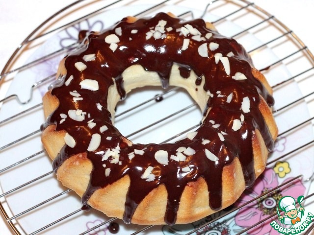 9. Охладите приготовленный кекс и выньте из формы. Растопите шоколад с молоком и вылейте сверху на кекс. Затем украсьте верх кекса миндальными лепестками и посыпьте сахарной пудрой.