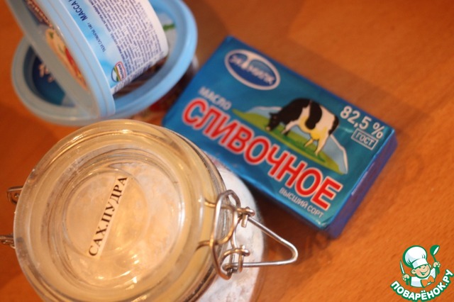 Для крема: масло комнатной температуры взбить с сахарной пудрой до пышности.