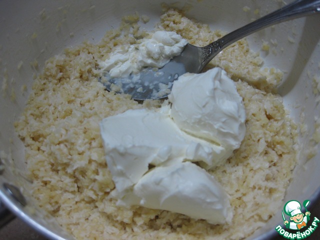 Остужаем до теплого, добавляем сыр и размягченное сливочное масло
