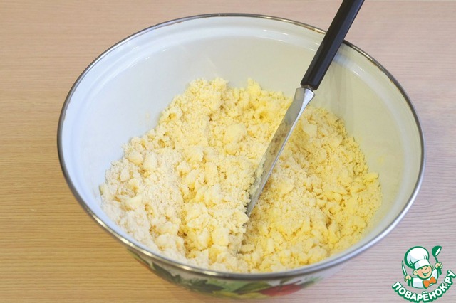 Творожно-сахарную массу добавить в масляно-мучную крошку. Смесь хорошо вымешать.