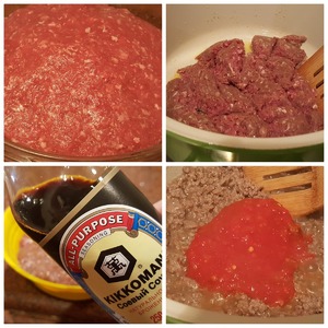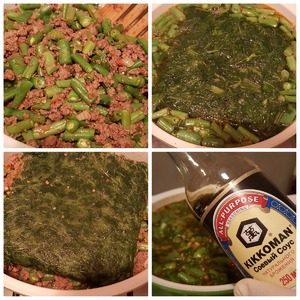 Мясо прокрутить в мясорубке с мелкой решеткой. Добавить 2 ст. л. соевого соуса, хорошо вымешать и оставить мариноваться минут на 20. Пока фарш маринуется, подготовить остальные ингредиенты. Достать из морозилки шпинат/фасоль, почистить лук.