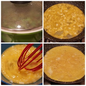 Довести суп до кипения. Убавить огонь. Закрыть кастрюлю крышкой и варить 5 минут, затем выключить нагрев и попробовать суп на соль, при желании досолить. Дать супу настояться хотя бы 30 минут. В это время смешать 2 яйца с мелконарезанным сыром, вылить в небольшую нагретую сковороду (при необходимости смазать маслом) и пожарить сырно-яичный блинчик. Выложить блинчик на доску и дать чуть остыть.