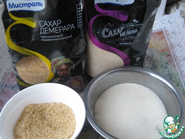 В этом рецепте я буду использовать два вида сахара ТМ "Мистраль"-сахар мелкий и сахар "Демерара"коричневый.