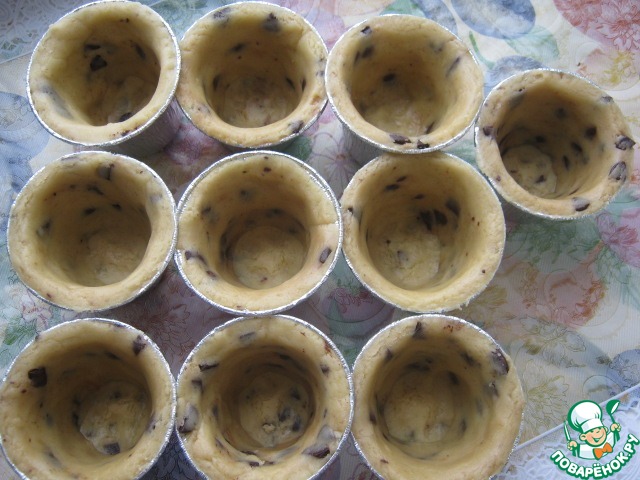 Я использую стаканчики из фольги высотой 5 см, диаметр донышка 4 см, диаметр верхней части 7 см. Смазываю их предварительно растопленным сливочным маслом. Из раскатанного теста вырезаю рюмкой кружочки и кладу их на дно.
