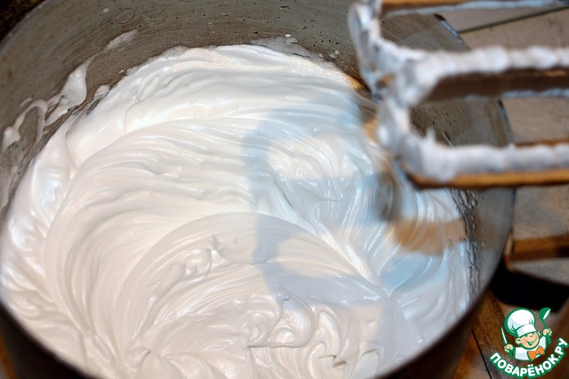 Взбить белки до мягких пиков, постепенно по ложке добавить сахар, продолжая взбивать.