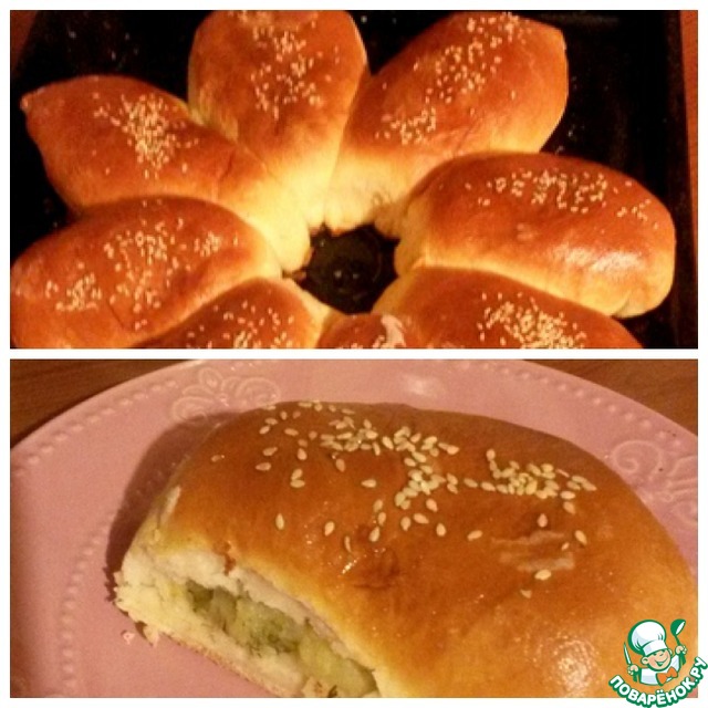 Яичный желток взбить с водой и смазать пирог. Посыпать кунжутом.