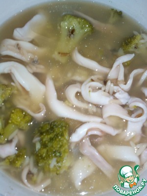 Закрываем крышку и даем супу настояться 10 минут. За это время и кальмары приготовятся. Подсаливаем по вкусу. -