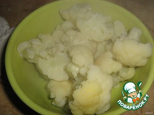 Отварить в подсоленной воде капусту, разобранную на соцветия. Минут- 5-10. Воду слить, отложить.