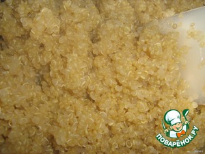 Киноа тщательно промыть в нескольких водах, чтобы ушла горечь. Поместить в кастрюлю, залить водой, слегка посолить. Довести до кипения, убавить огонь и варить до готовности 15-20 минут. Слить воду, отложить.