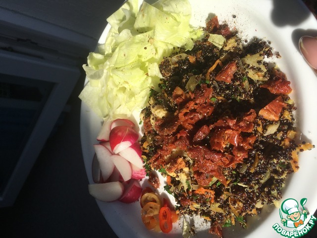 Приготовила салат по вашему рецепту, но чуток со своими изменениями: нам нельзя кукурузу, делала без нее; также добавила репчатый лук перьями в момент обжарки перца и морковки. И чеснок я всегда добавляю в готовое блюдо в самом конце, иначе он теряет свой аромат. Киноа черное, орегано не было