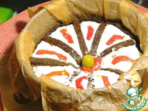 2. Аккуратно выкладываем в корзиночку из хлеба. Украсить полосками из корочек, перцем и оливками (см. снимок).