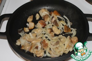 Лук режем тонкими полукольцами и обжариваем на смеси растительного и сливочного масел (последнего нужно взять 25 граммов).