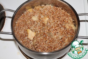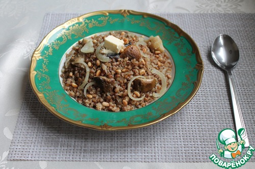 Украшаем кашу оставшимися грибами с луком. Кладем масло на горячую кашу. Можно положить и больше 25 граммов, ведь, как известно, кашу маслом не испортишь!)