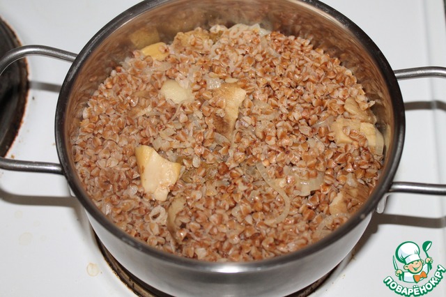 Гречку промываем до прозрачной воды. В сотейник кладем обжаренные грибы с луком (часть можно отложить для украшения) крупу и заливаем грибным бульоном. При необходимости можно еще подсолить. Закрываем крышкой и варим на слабом огне до готовности крупы (15-20 минут). Можно укутать полотенцем и оставить упревать на полчаса.