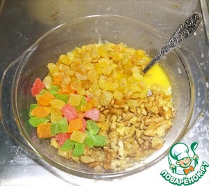 К маслу с шоколадом добавляем измельченные орехи, изюм, цукаты. В моих плитках шоколада уже были кокосовая стружка и кусочки миндаля. Изюм, если он очень сухой, можно предварительно замочить или обдать кипятком. Получившуюся массу помещаем в холодильник на час.