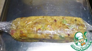 После этого перекладываем массу в пищевую пленку, формируем колбаску, плотно пленкой оборачиваем и отправляем в морозилку на 2 часа, до полного застывания.