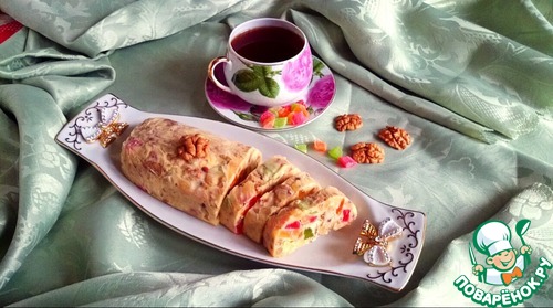 Лакомство напоминает привычный мне щербет весьма отдаленно, поэтому оригинальное название все-таки в кавычках, однако, получается очень вкусно: достаточно приторно, но с небольшой кислинкой, оттеняющей сладость. Наполнение в виде орехов, цукатов и сухофруктов может быть любым! Как показала практика, даже кокосовая стружка более чем уместна. К чаю - самое то! Хранится десерт в морозилке, что очень удобно: в любой момент - достаем, нарезаем и подаем!
