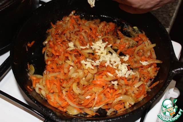 • Морковь натереть на крупной терке, лук нарезать полукольцами и обжарить с щепоткой соли на смеси сливочного и растительного масел. В конце жарки добавить раздавленный чеснок.