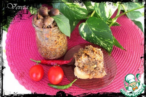 Грибная икра - вещь поистине замечательная! Если у вас в холодильнике стоит банка грибной икры, - вы счастливый человек! Потому что грибная икра - это, во-первых, отличная закуска и на гренки, и на свежий хлебушек, и просто так; во-вторых, добавьте пару ложек грибной икры в гречневую кашу, в тушеную капусту, в отварной рис и т. д., и у вас образуется новое блюдо; в-третьих, смешайте картофельное пюре с грибной икрой, - вот вам и начинка для пирогов и блинчиков; нафаршируйте отварные яйца грибной икрой, - вкуснота неимоверная; добавьте немного в борщ, и он заиграет новыми красками вкуса. Предлагаю свой вариант замечательной грибной икры, вкус которой дополнен сладостью моркови и лука, наполнен пряным ароматом грецких орехов и усилен соевым соусом.