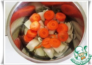 Лук и морковь очищаем и нарезаем достаточно крупно, укладываем в кастрюлю, ставим на огонь и тушим под крышкой, периодически мешая, до полной мягкости моркови, около 25-30 минут.