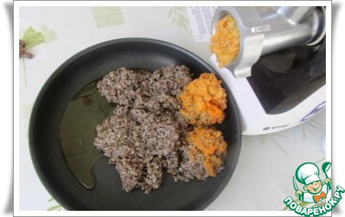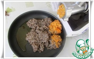 • Грибы и немного остывшие овощи пропускаем через мясорубку прямо в сковороду. Выливаем из сотейника масло, в котором овощи тушились.