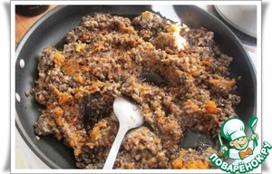 Грибы и немного остывшие овощи пропускаем через мясорубку прямо в сковороду. Выливаем из сотейника масло, в котором овощи тушились.