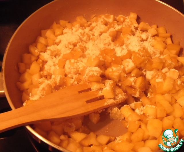 В сковороде растапливаем слив. масло, выкладываем яблоки, обжариваем около 10 минут, добавляем коричневый сахар, помешиваем, доводим до загустения сиропа. Добавляем 1 ст. л. муки, тщательно перемешиваем. Готово. За рецепт приготовления такой начинки хочу сказать огромное СПАСИБО поваренку Оленьке lelikloves! Яблоки не теряют сок, который частенько вытекает и прижаривается. Замечательная начинка подходит для разных изделий.