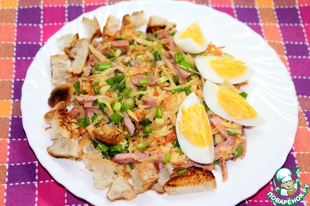 Спасибо за необыкновенно вкусный и праздничный рецепт салата Непревзойденная гамма вкусов получилась Готовила с некоторой адаптацией под свой стиль питания, так как не ем жареное, то хлеб подсушила на сухой сковороде. Хлеб был еще с небольшой кислинкой, так как готовила из цельнозерновой муки и настаивала подольше. Эта хлебная кислинка была очень кстати в общей гамме всех ингредиентов Масло добавляла уже в сам салат. Ветчину не употребляю, поэтому использовала вареную курицу. Готовой горчицы не нашлось под рукой, а хрен не продают в моей местности и вовсе. Моя капуста была хорошо "проквашена" и уже ощущалась своя горчичная нотка, поэтому на яркости вкуса, отсутствие дополнительной горчицы, влияние не оказало. Как будет зелень, то и с ней буду готовить для более праздничного варианта, а сегодня был просто чудесный обед