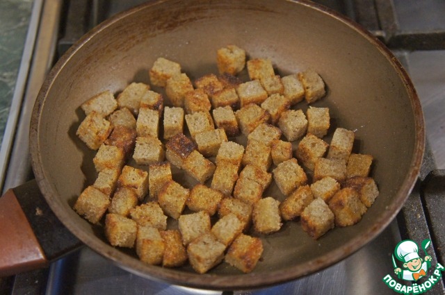 • Хлеб нарезать маленькими кубиками и обжарить на растительном масле до румяной корочки.