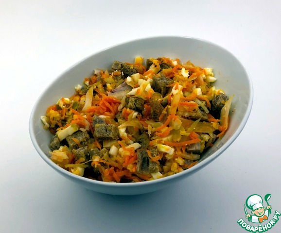 Подобный салат со свежей капустой совсем бы не покатил, а квашеная очень хорошо в нем себя чувствует.