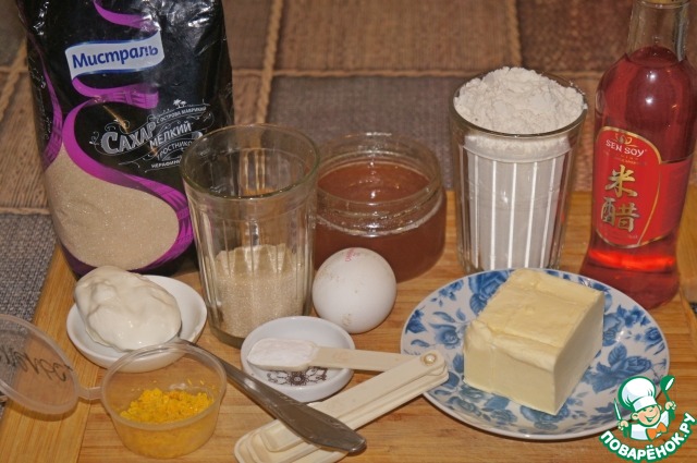 • Масло растопить и добавить в него ингредиенты в перечисленном порядке: сахар, мед, сметана, яйцо, цедра. После каждого ингредиента хорошо перемешивать массу. В последнюю очередь добавить соду, погашенную каким-нибудь ароматным уксусом (яблочный, рисовый, винный).