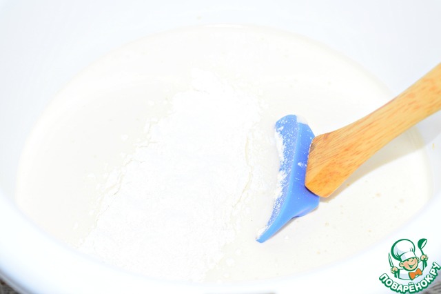 В несколько приемов всыпать просеянную муку. Каждый раз мешать тесто лопаткой движениями снизу вверх аккуратно, но тщательно.