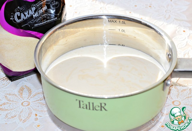 Поместить емкость со сметанно - сахарной массой на водяную баню и варить, постоянно помешивая, пока масса не загустеет.