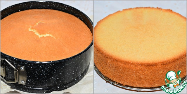 Готовый бисквит немного остудить в форме, затем аккуратно провести тонким ножом по бокам формы, вынуть бисквит и полностью остудить его. (я снимаю боковину формы, накрываю бисквит решеткой, переворачиваю и без сложностей снимаю пергамент)