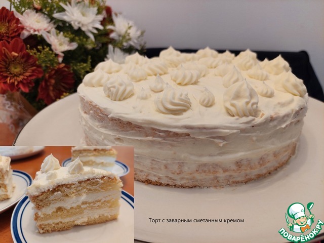 Простой и незатейливый домашний бисквитный торт с заварным сметанным кремом. Легкий, воздушный, нежный, в меру сладкий. Совсем несложный! Очень удобен тем, что и бисквит, и крем можно приготовить заранее. Заходите, угощайтесь. Это вкусно!